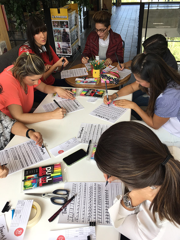 El taller de lettering lo realizamos con una técnica llamada brush lettering, en la cual se realiza un ejercicio de caligrafía utilizando un marcado con punta de pincel. En su nivel básico se trata de aprender a usar este marcador y a saber como funciona esta técnica. Es muy fácil y todas las personas que han asistido a mis talleres han aprendido a hacerlo.